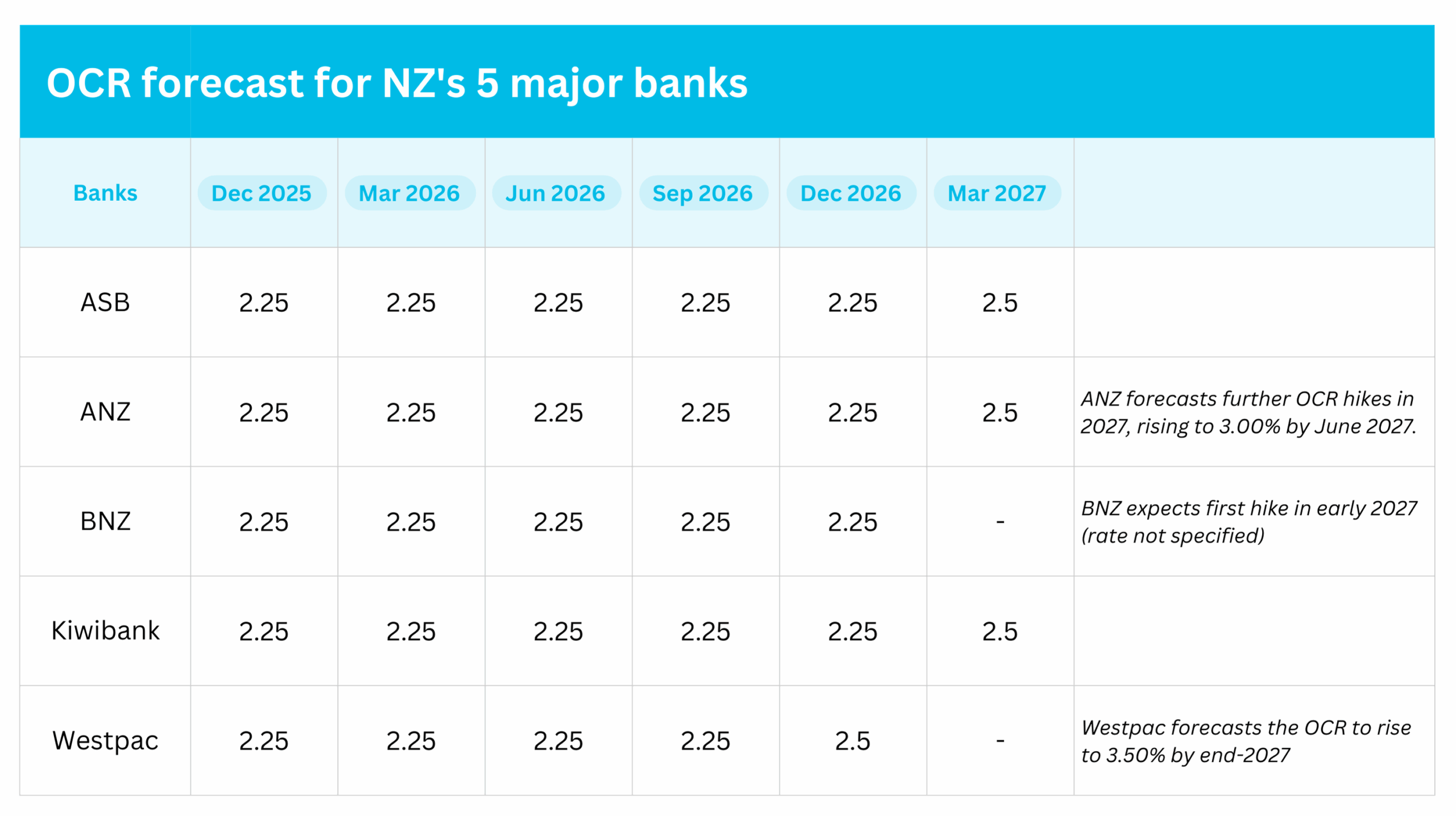 Below, we break down the forecasts from the 5 major banks, so you can see where things are headed – clearly and simply. The OCR is expected to hold steady at 2.25% throughout 2026. Some are forecasting a lift to 2.50% by early 2027, with longer-term projections hinting at possible rate increases beyond that. But for now, the message is consistent: no sharp moves on the horizon.